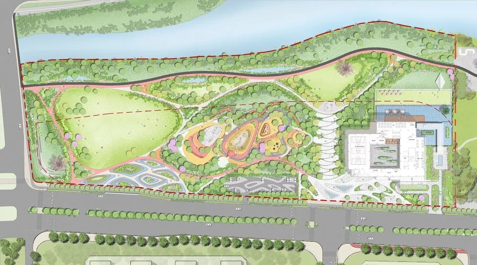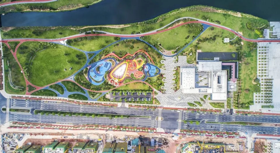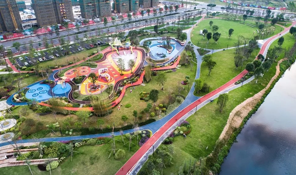 华夏幸福龙溪湖公园位于江门市江海高新区新城的中央绿轴尽端,北临龙溪湖,东接绿轴公园。龙溪湖现状周边以工业区为主,它是新城打造的第一个重要节点,连接未来的住宅区,产业办公区,与整个城市生态公园网络。